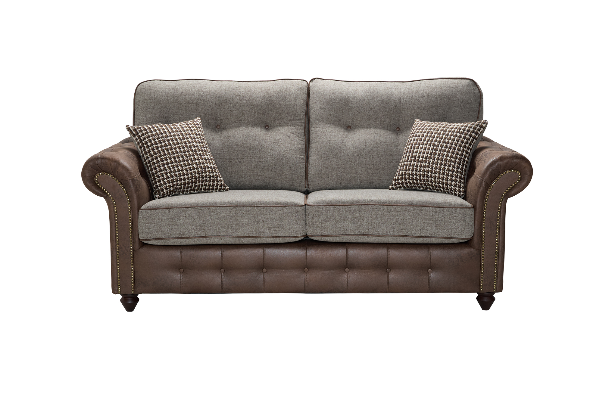 One of our longest established, best-selling models. Each piece is unique, every button and stud are carefully crafted to give this sofa character in abundance. Available in a choice of leather look, with a contrast plain fabric.